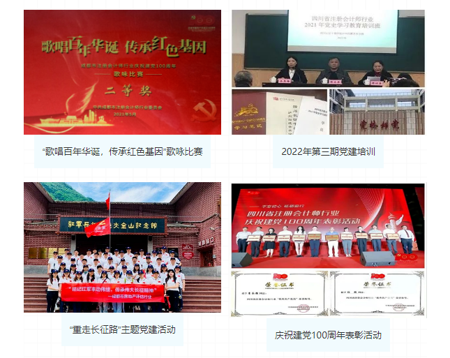 ● 2021年1月组织举办了“支部慰问进社区,浓浓暖意迎新春”的帮扶活动;4月召开党史学习教育动员大会、党史专题教育讲座;6月组织开展“学党史办实事,送党恩暖人心”,开展“记录百年辉煌,感悟初心使命”的主题征文、摄影活动,7月开展庆祝建党100周年活动;10月赴遂宁市蓬溪县大石镇牛角沟村——“四川红军第一村”开展“推进党史学习,传承红色基因”主题党日活动;11月在疫情严峻的情况下参与到志愿服务中,与群众一起抗击疫情;12月开展学习宣传贯彻党的十九届六中全会精神会议;