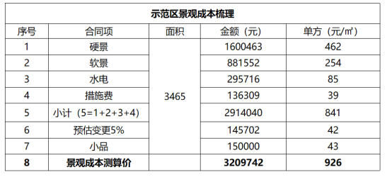 b 景观单方:示范区景观目前测算单方为926元/㎡(含5%预估变更) ,景观单方在目标成本1000元/㎡内 ,示范区后期施工中应将预估变更控制在5%以内。后期未实施大区景观测算单方为414元/㎡ (含5%预估变更),整体景观目标成本可控。
